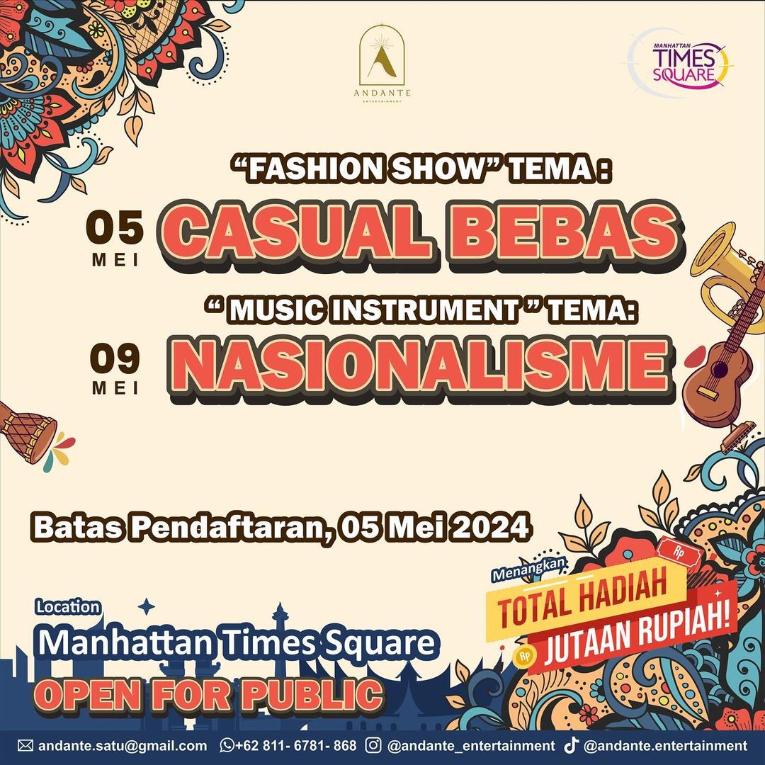 Manhattan Times Square bekerjasama dengan Andante Entertainment mengadakan Andante Festival Music & Fashion 2024, yang diselenggarakan pada tanggal 05 & 09 Mei 2024 di L3. Acara ini terdiri dari beberapa rangkaian acara, di tanggal 05 mei 2024 event fashion dan di tanggal 09 mei 2024 event music.