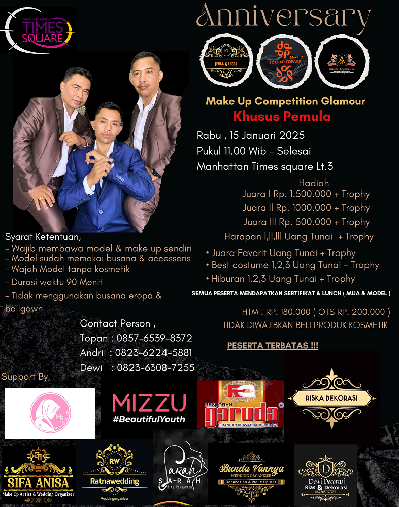 Manhattan Times Square bekerjasama dengan Ifull Galeri, Make Up Toepan Topana & Andri Aquarius Wedding Organizer mengadakan event Make Up Glamour Competition khusus pemula, yang diselenggarakan pada tanggal 15 Januari 2025 mulai pukul 11.00 WIB di L3 – Mall Manhattan Times Square