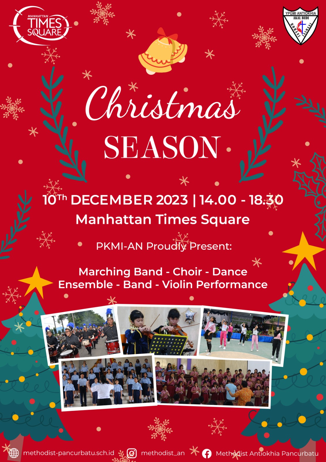 Manhattan Times Square bekerjasama dengan Perguruan Kristen Methodist Antiokhia mengadakan Christmas Season , yang diselenggarakan pada tanggal 10 Desember 2023 mulai pukul 14.00 WIB di Manhattan Times Square-L3. Acara ini sangat seru karena terdiri dari beberapa rangkian acara , sepert : Marching Band, Choir, Dance, Ensemble, Band dan Violin Performance. Ayoo saksikan keseruan Christmas Season