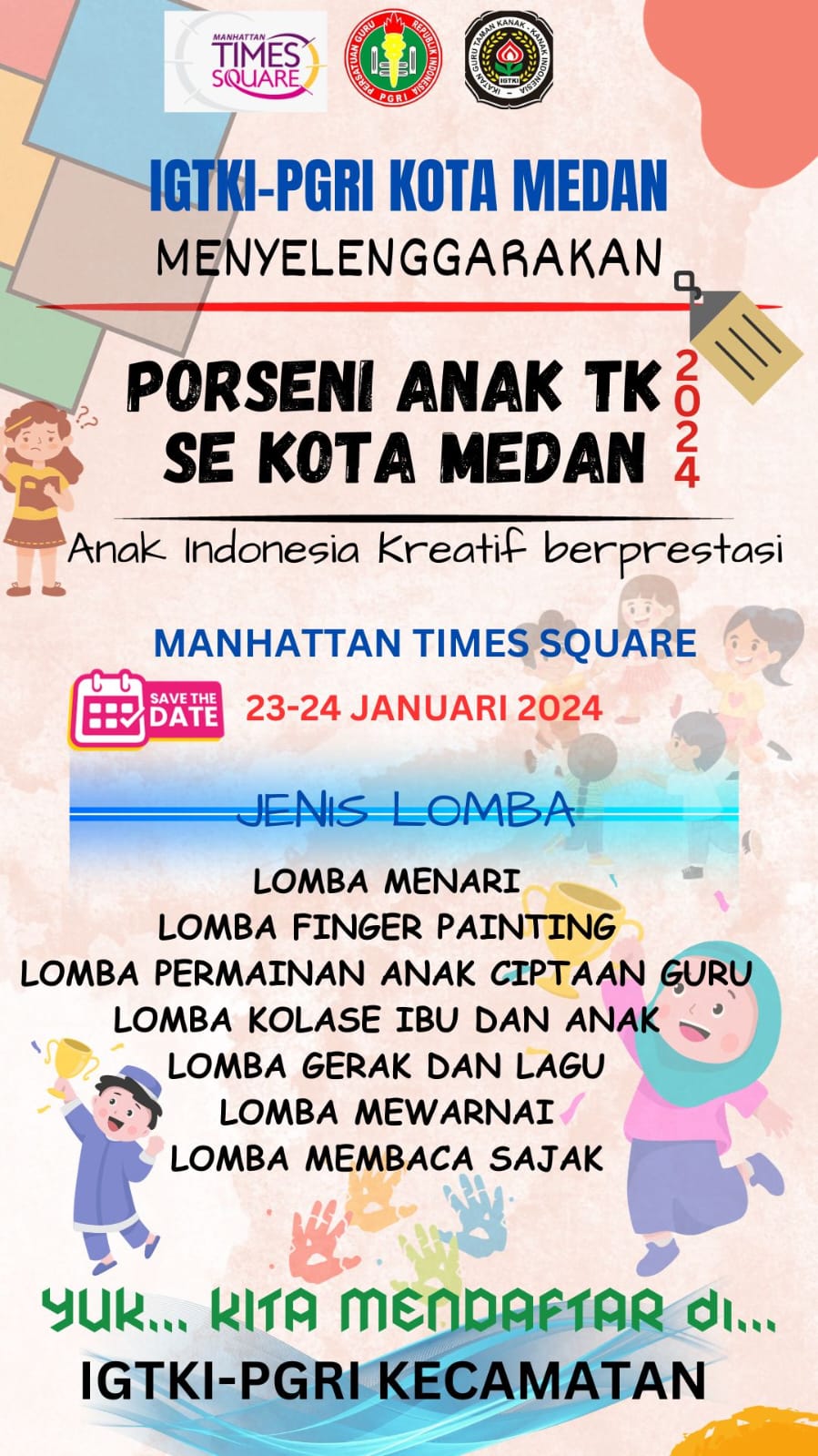 Manhattan Times Square bekerjasama dengan PGRI dan IGTKI mengadakan Porseni Anak TK Sekota Medan 2024, yang diselenggarakan pada tanggal 23-24 Januari 2024 di L3 dan L2. Acara ini sangat seru karena terdiri dari berbagai kegiatan seperti : Mewarnai, Membaca Sajak, Kolase Ibu dan Anak serta finger painting. Ayo datang dan saksikan keseruan Porseni Anak TK Sekota Medan 2024 di L3 – L2 .