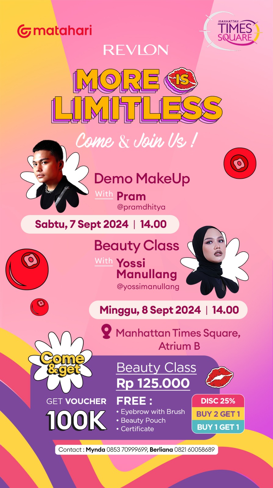 Manhattan Times Square bekerjasama dengan Matahari Dept.Store Manhattan mengadakan event Revlon More Is Limitless, yang diselenggarakan pada tanggal 7-8 September 2024 mulai pukul 14.00 WIB di Atrium B – Mall Manhattan Times Square. Acara ini sangat bagus dan menarik karena diadakan selama 2 hari, di hari pertama akan ada demo make up bersama Pram (@pramdhitya) dan di hari kedua Beauty Class bersama Yossi Manullang (@yossimanullang)